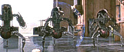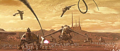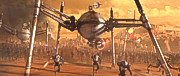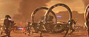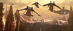 In der Zwischenzeit kamen die Jedi den Attentätern auf die Spur, und erkannten viel zu spät, was seit beinahe 10 Jahren im Gange war, ohne dass jemand davon gewusst hatte: Eine Armee aus Klonsoldaten war bereits lange in der Produktion und stand kurz vor der Fertigstellung. Ein lange verstorbener Jedi hatte sie für die Republik in Auftrag gegeben. Ausbruch auf GeonosisDie Spur führte nach Geonosis, wo Obi-Wan Kenobi eine gewaltige Kampfdroidenproduktion der Separatisten entdeckte. Kurz darauf wurde er gefangengenommen, wie auch Anakin Skywalker und Senatorin Amidala, die zu seiner Rettung eilten. Der Rat der Jedi beschloß daraufhin, auf Geonosis einzufallen. Mace Windu führte die Jedi zur Befreiung der Gefangenen, Yoda nahm die Klonarmee in Augenschein und führte sie nach Geonosis, wo sie sich der bereitstehenden Kriegsdroidenstreitmacht stellte. Es entbrannte die Schlacht von Geonosis, die zum Ausgangspunkt der Klonkriege wurde. Leider erkannten die Jedi und auch der Senat die Verbindung nicht, die zwischen den beiden Seiten bestand, dass nämlich der Anführer der Separatisten, Count Dooku selbst, es gewesen war, der als Tyranus das Vorbild für die Klonsoldaten ausgewählt hatte, den Kopfgeldjäger Jango Fett. Dooku hatte damit sowohl die Bewegung geschaffen, die gegen die Republik aufstand, wie auch die direkte militärische Antwort darauf. Durch ihn war Krieg vorprogrammiert. Dass hinter ihm noch jemand ganz anderes stand, sollten die Jedi erst noch viel später erfahren. Krieg in der gesamten GalaxisIn der Schlacht von Geonosis waren Klontruppen der Republik und Kriegsarmeen der Separatisten ein erstes Mal aufeinander getroffen. Die Klonkriege waren ausgebrochen und von da an folgten kriegerische Auseinandersetzungen auf vielen Welten. Der Kampf um die Galaxis hatte begonnen.