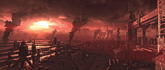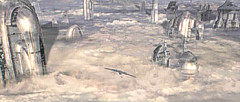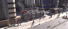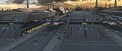 Ausgedehnte Industrieflächen erstreckten sich teilweise bis zum Horizont. An anderen Stellen waren Werke und Industriebetriebe mit Dienstleistungsvierteln durchmischt. Von den großen Frachterraumhäfen aus starteten Transporter in alle Teile der Galaxis. Coruscant beherbergte auch gewaltige militärische Zonen und Raumhäfen, auf denen große Truppenverbände stationiert waren und während der Klonkriege in die Kriegsgebiete starteten. |