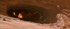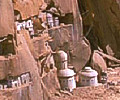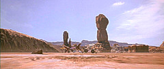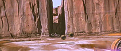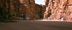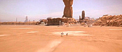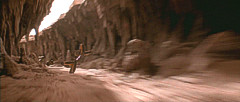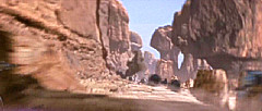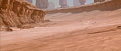 Bevor sich der Rundkurs wieder dem Ausgangspunkt zuwendete, war ein weiterer Canyon zu meistern. Enge Kurven durch eine Felsschlucht verlangten einmal mehr Höchstleistungen von den Fahrern. Das gefährlichste Stück war jedoch das Endportal dieses Canyons, ein Spalt, der so schmal war, dass die Podracer auf die Seite gelegt werden mussten, um überhaupt hindurch zu passen. Nach diesem letzten Nadelöhr lag wieder die weite, flache Ebene vor den Rennteilnehmern, die sie direkt zur Mos Espa Grand Arena zurückbrachte. Höchstgeschwindigkeiten entschieden auf diesem letzten Teilstück, und der Fahrer mit dem schnellsten Podracer konnte auf dieser Gerade die Konkurrenz noch einmal das Fürchten lehren. Zielpunkt war nach drei Runden zuletzt die Kurve der Grand Arena. |